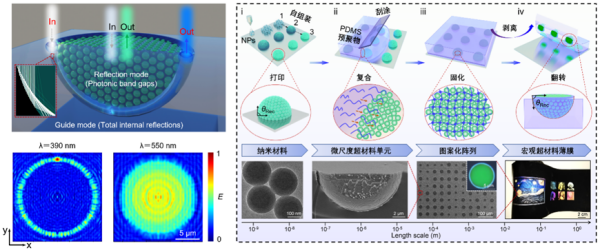 该研究在多尺度光学超材料体系中,实现了几何光学与波动光学的有机统一,为解析跨尺度光传输行为提供了统一的物理视角。同时,研究系统揭示了多尺度光学超材料的光场调控规律,阐明了微纳结构参数与宏观光学性能之间的内在构效关系:通过精准调控光子晶格常数与超组装体特征尺寸,可精确控制超材料的光子带隙结构与光传播路程差,进而实现对体色散与界面色散的独立调制;采用集成打印技术,可将具有不同晶格常数、不同特征尺寸的超组装体高精度图案化,赋予超组装体系从微观到宏观的跨尺度光学集成能力。此外,该超材料还具备优异的本征柔性与环境稳定性,为其在柔性可穿戴光学、智能传感等领域的应用拓展了空间。《自然》审稿人对此评价道:这篇稿件的结果太有意思了,所开发的可打印超组装策略新颖而且有吸引力。