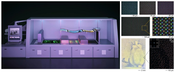 针对以上技术瓶颈,研究团队首先从结构着手,创制出一种由周期性纳米晶格构成的微米尺度半球形结构,该结构通过协同光子晶格与光学界面的耦合作用,对多尺度下的光学传输行为进行精准调控,使得单元结构呈现丰富的色彩变幻,犹如万花筒般一转千色。在规模化制备方面,团队研发了高通量按需打印与卷对卷连续制造工艺,就像报纸印刷一样,将柔性基材从一个滚筒连续输送到另一个滚筒,连续完成纳米级精度打印成型,这一技术可将低成本聚合物纳米材料快速制备为单像素性能定制的光学超材料,实现跨越多个尺度的精准制造。
