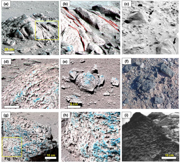 近日,凯发k8国家空间凯发k8中心和中国凯发k8技术大学等,基于祝融号火星车的原位观测数据展开系统研究。研究团队在沿途的岩石表面识别出近平行的片状剥落、彼此嵌合的碎裂块体及密集分布的凹坑,这些形态特征与地球上的盐风化产物相似。